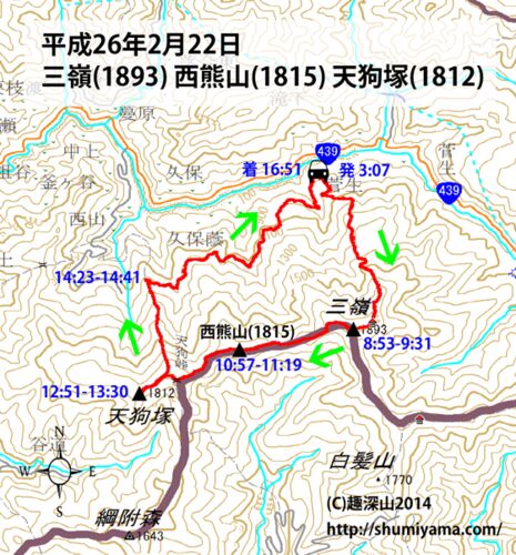 平成26年2月22日 晴れ 三嶺(1893) 西熊山(1815) 天狗塚(1812) 【記録】 いやしの温泉郷 発 3:07--- 林業作業小屋跡 (5:03-5:20) --1791m標高点 (7:41-7:50) --菅生下山口標識 8:19 ---三嶺ヒュッテ 8:25--- 三嶺 (8:53-9:31) ---西熊山 (10:57-11:19) ---お…