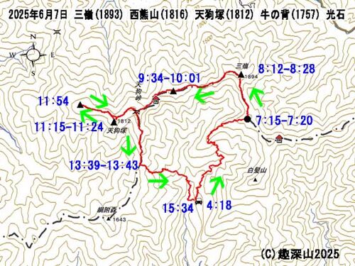 2025年6月7日 三嶺(1893) 西熊山(1816) 天狗塚(1812) 牛の背(1757) 光石【コース】光石 三嶺(1893) 西熊山(1816) 天狗塚(1812) 牛の背(1757) 光石【天候】 曇【記録】ヒカリ石登山口 4:18 --- 西熊林道ゲート 4:33--- 西熊林道 ---さおりが原 5:24 --- カヤ…